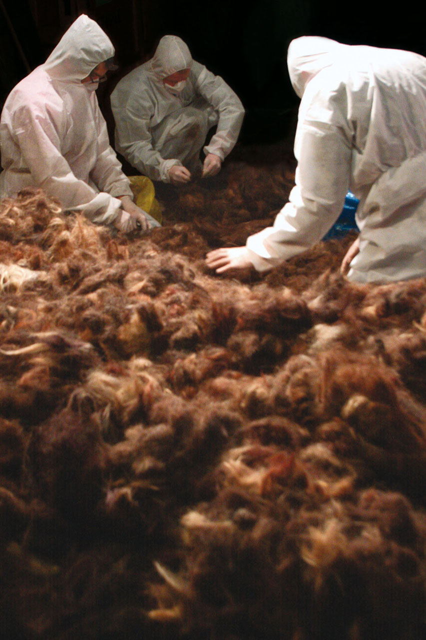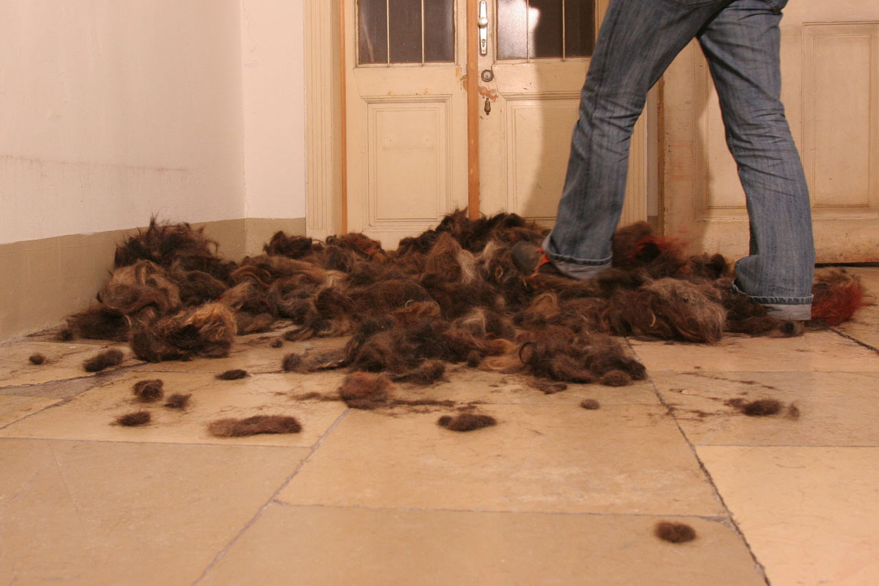 Hair from salons all over the city is collected, washed and graces the floors of the exhibition rooms. Visitors are invited to walk over this carpet of human hair and contribute to its becoming even more matted.
